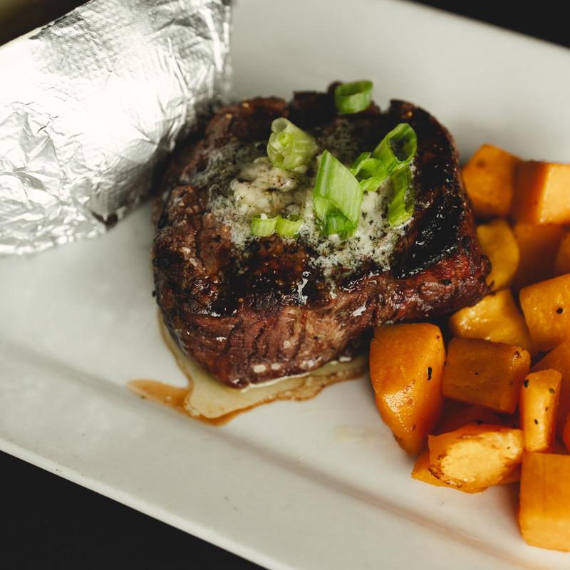 All entrees served with House or Caesar salad, veggies, and a starch • Over The Top: Grilled Candied Onions +$4.00 | Mushrooms +$4.00 | Gorgonzola +$4.00 | Demi Glace +$6.00 | Bourbon Cream Sauce +$6.00 | 4 Grilled Shrimp +$8.00